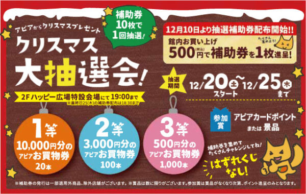 12月10日(水)よりアピア各店(一部店舗を除く)にてお買上500円毎に抽選会の補助券を配付いたします。補助券10枚で1回抽選することができます。