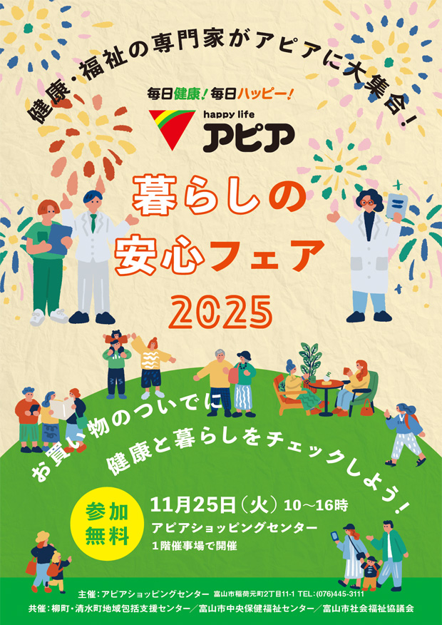 11月25日(火) 10〜16時 1階催事場にて、暮らしにつながる 健康・福祉 促進のイベント「アピア暮らしの安心フェア2025」を開催します。